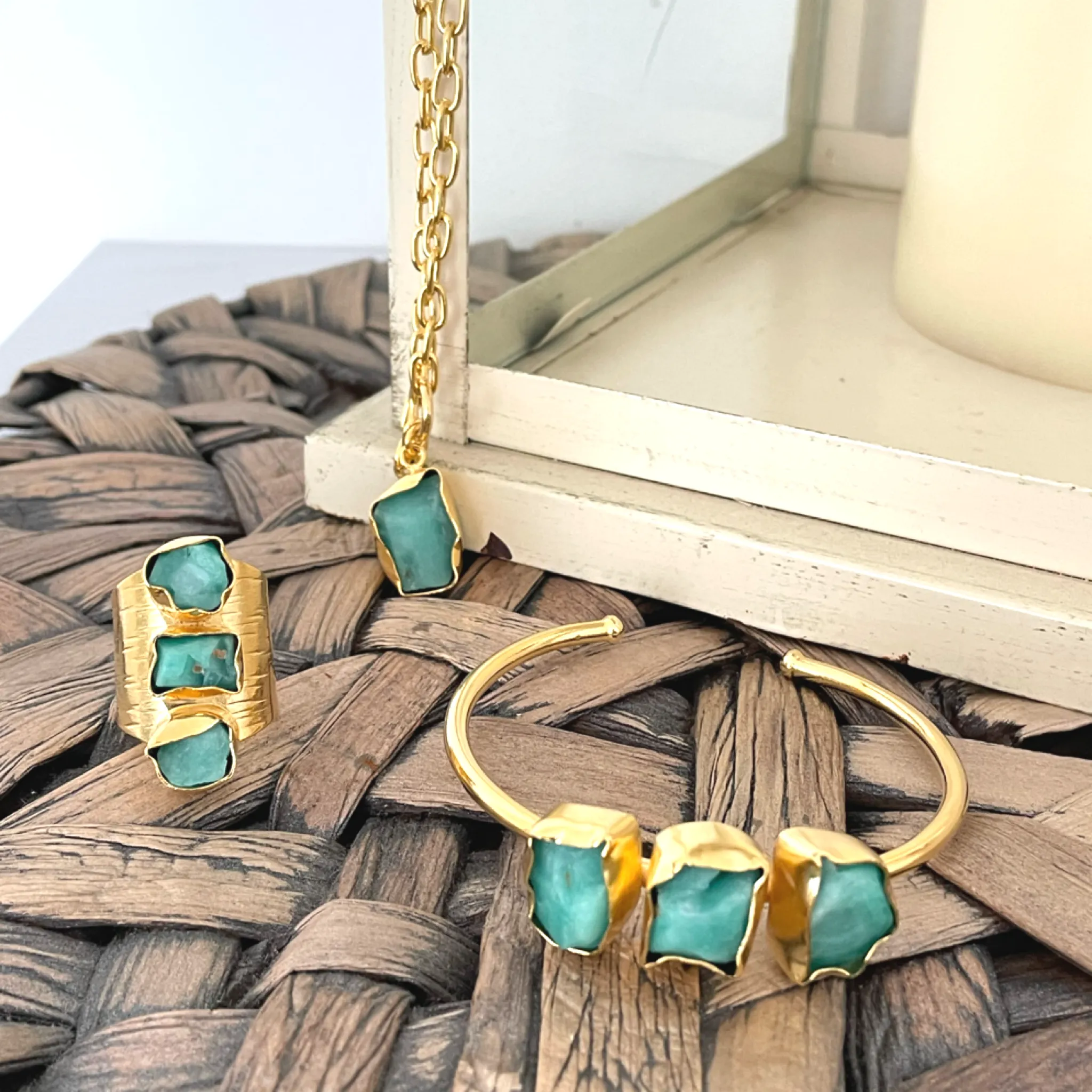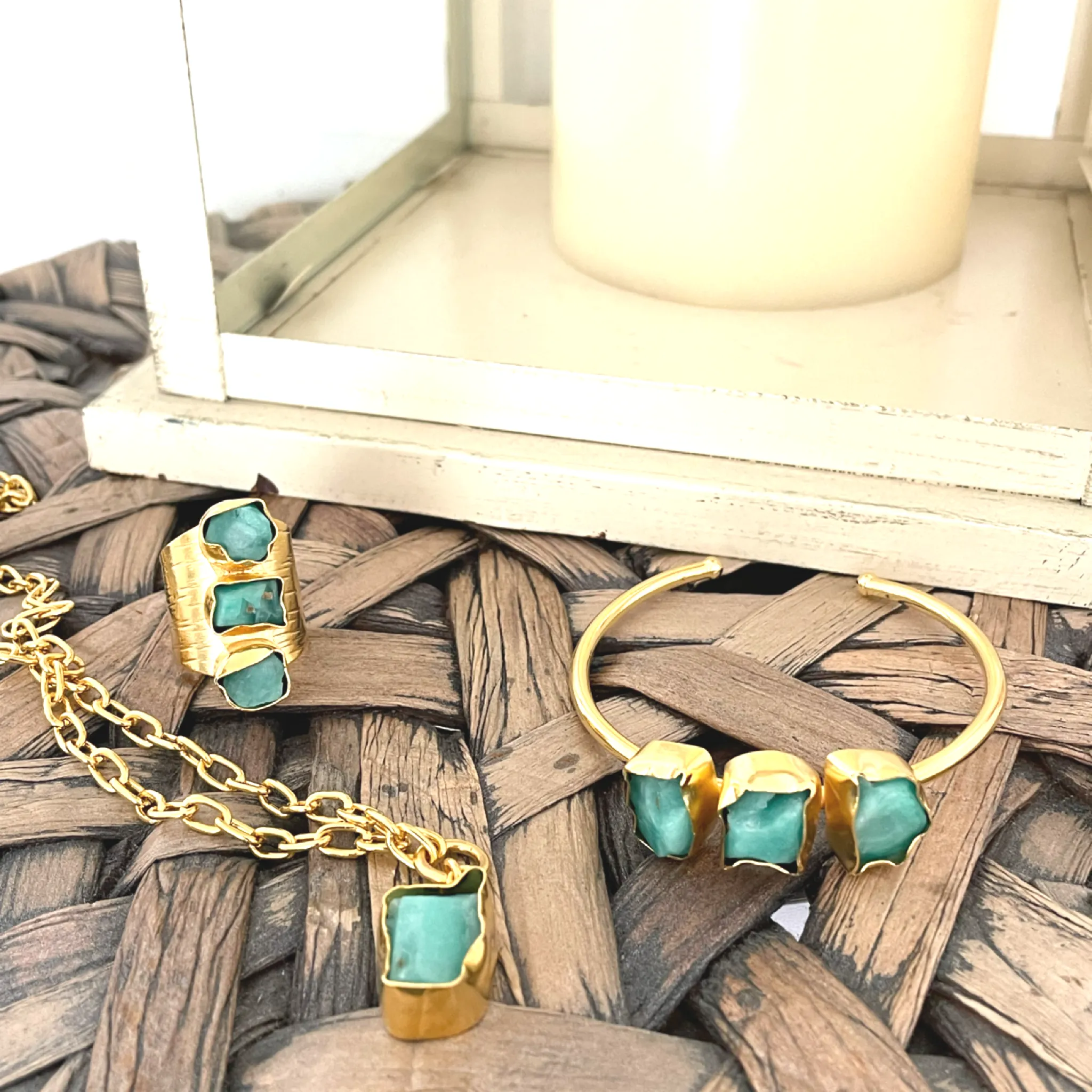 Juego Comoleto, Anillo + Brazalete + Cadena Baño de Oro, Cada Pieza con Engastes en Murralla de Esmeralda.